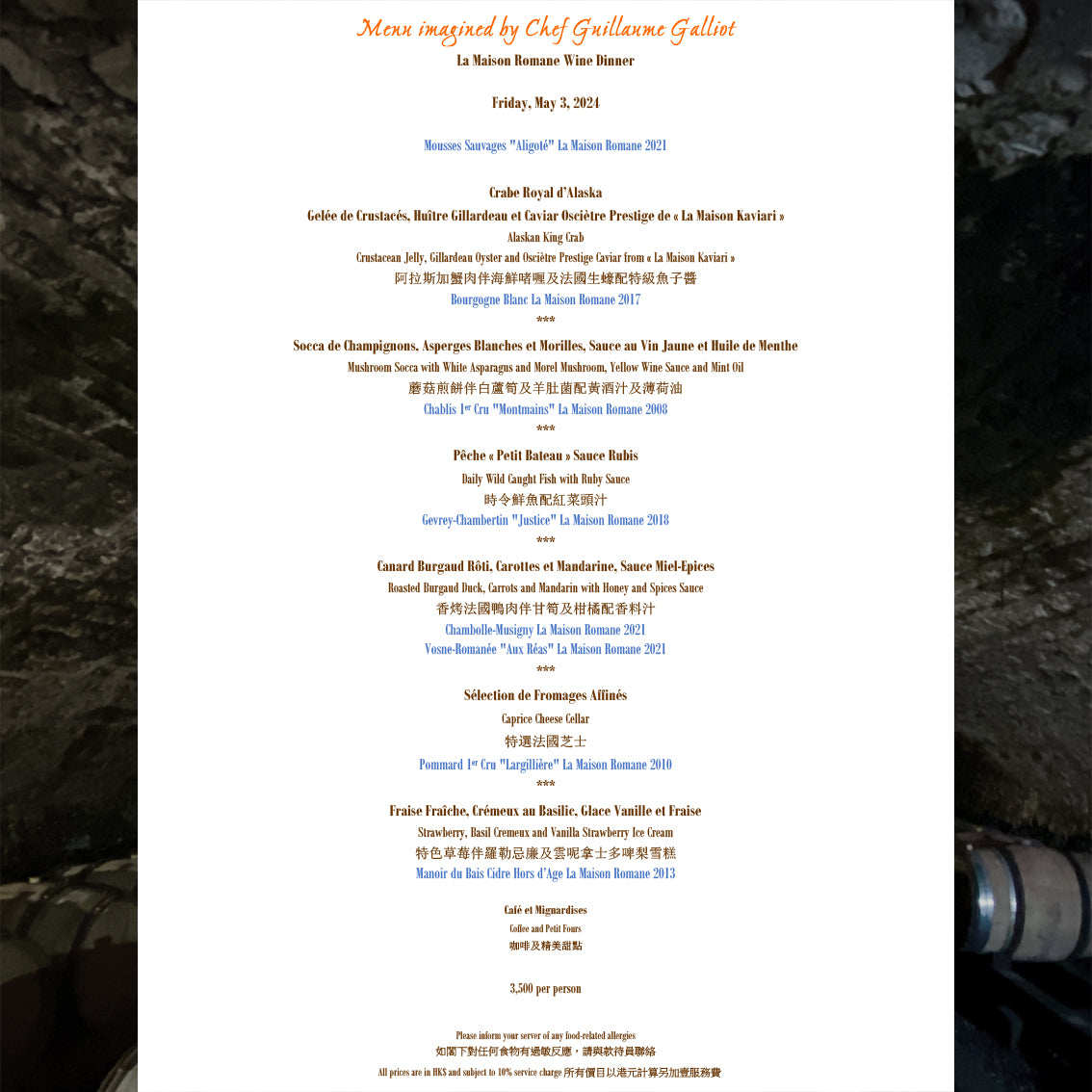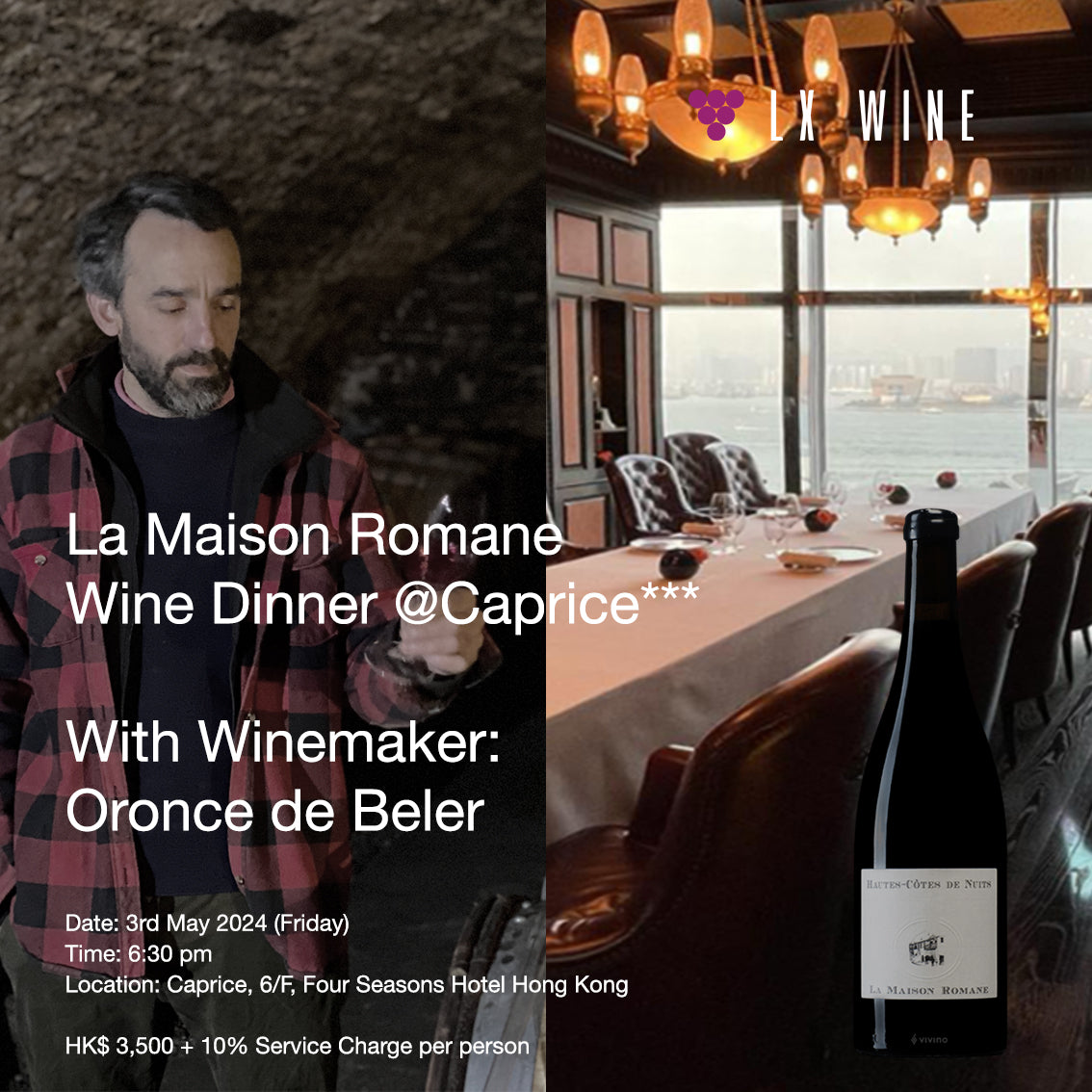 Enjoy the wines of La Maison Romane from Burgundy with the winemaker Oronce de Beler at Caprice with a menu specially curated by Michelin 3-stars chef Guillaume Galliot.